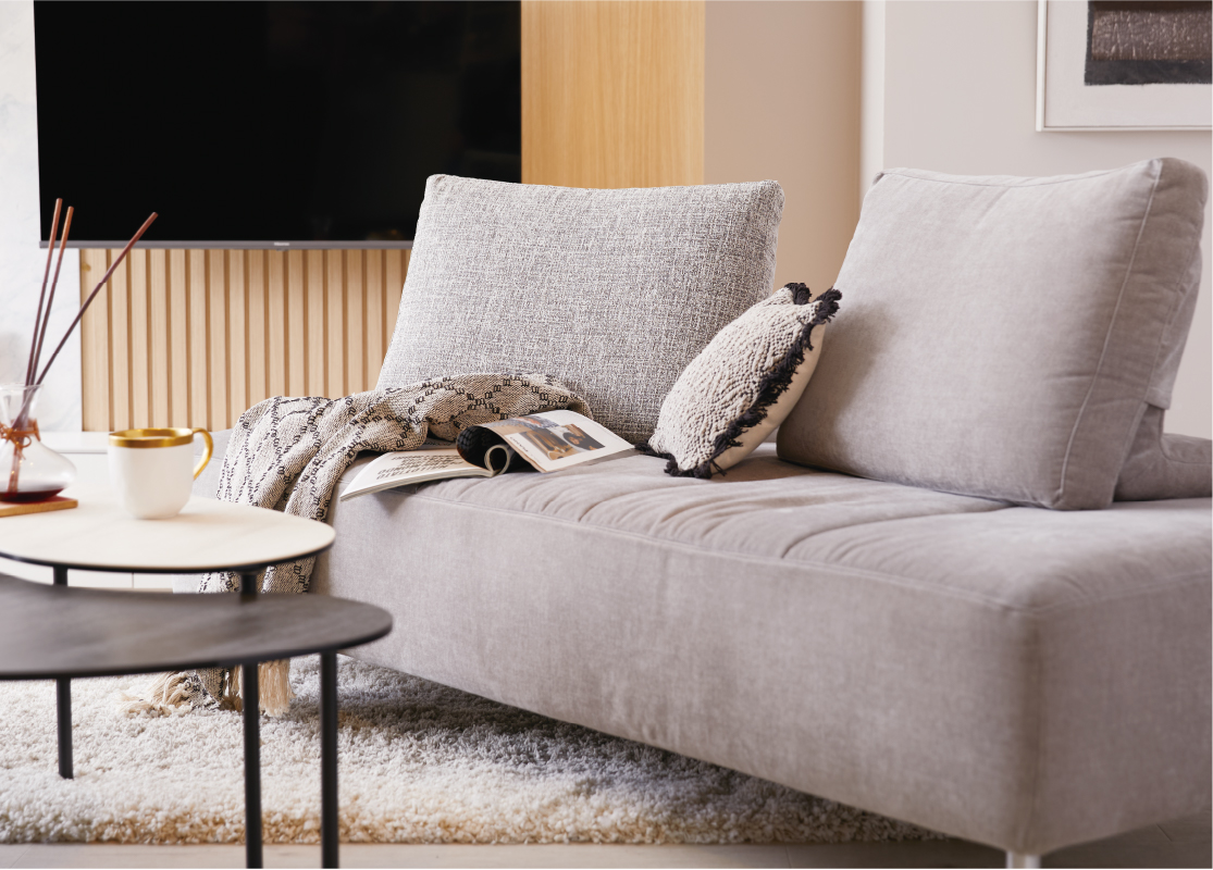 360度フリースタイルなソファが住まう人の心をほぐし、華やかなアートも似合うリビングに。